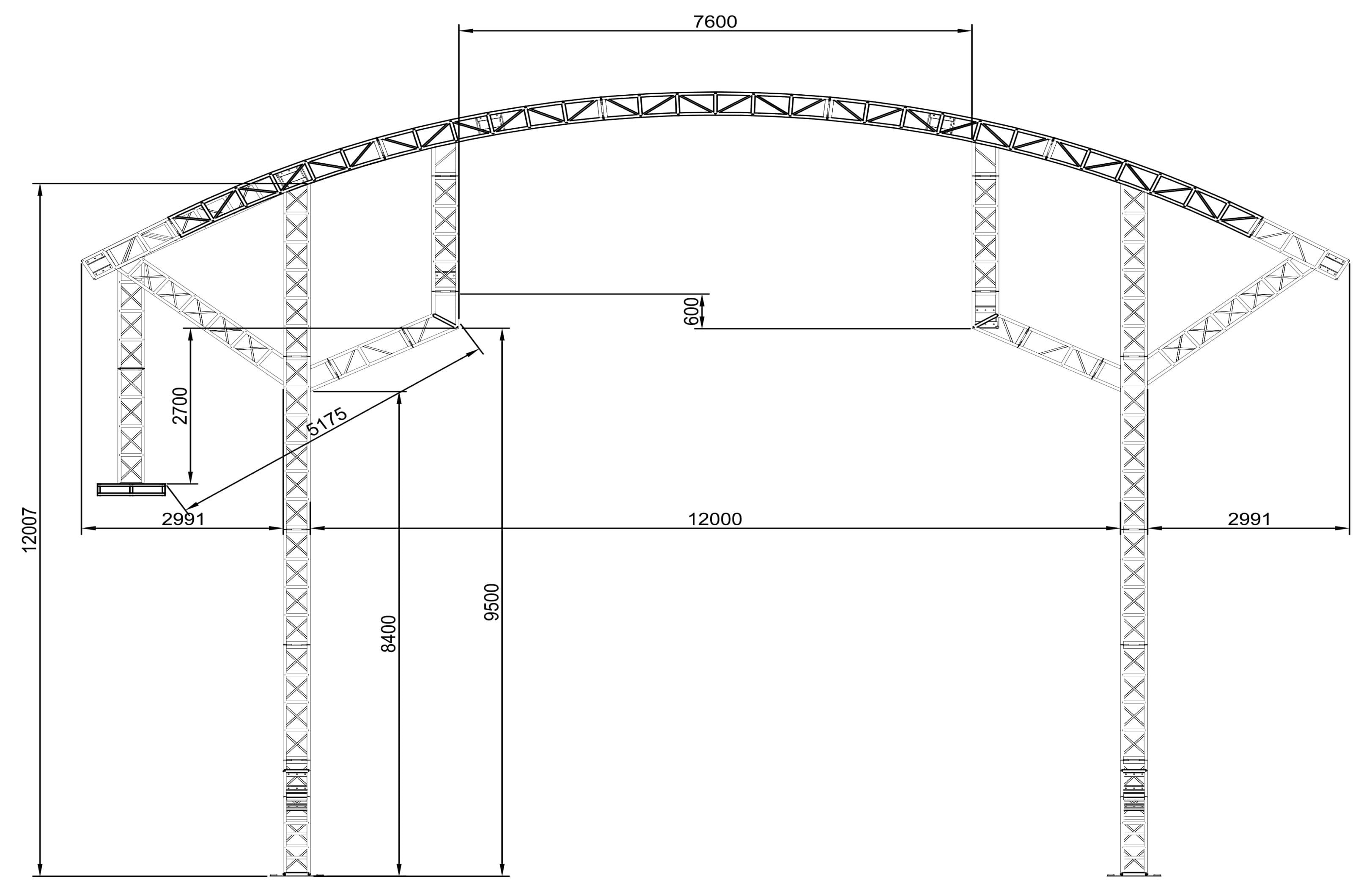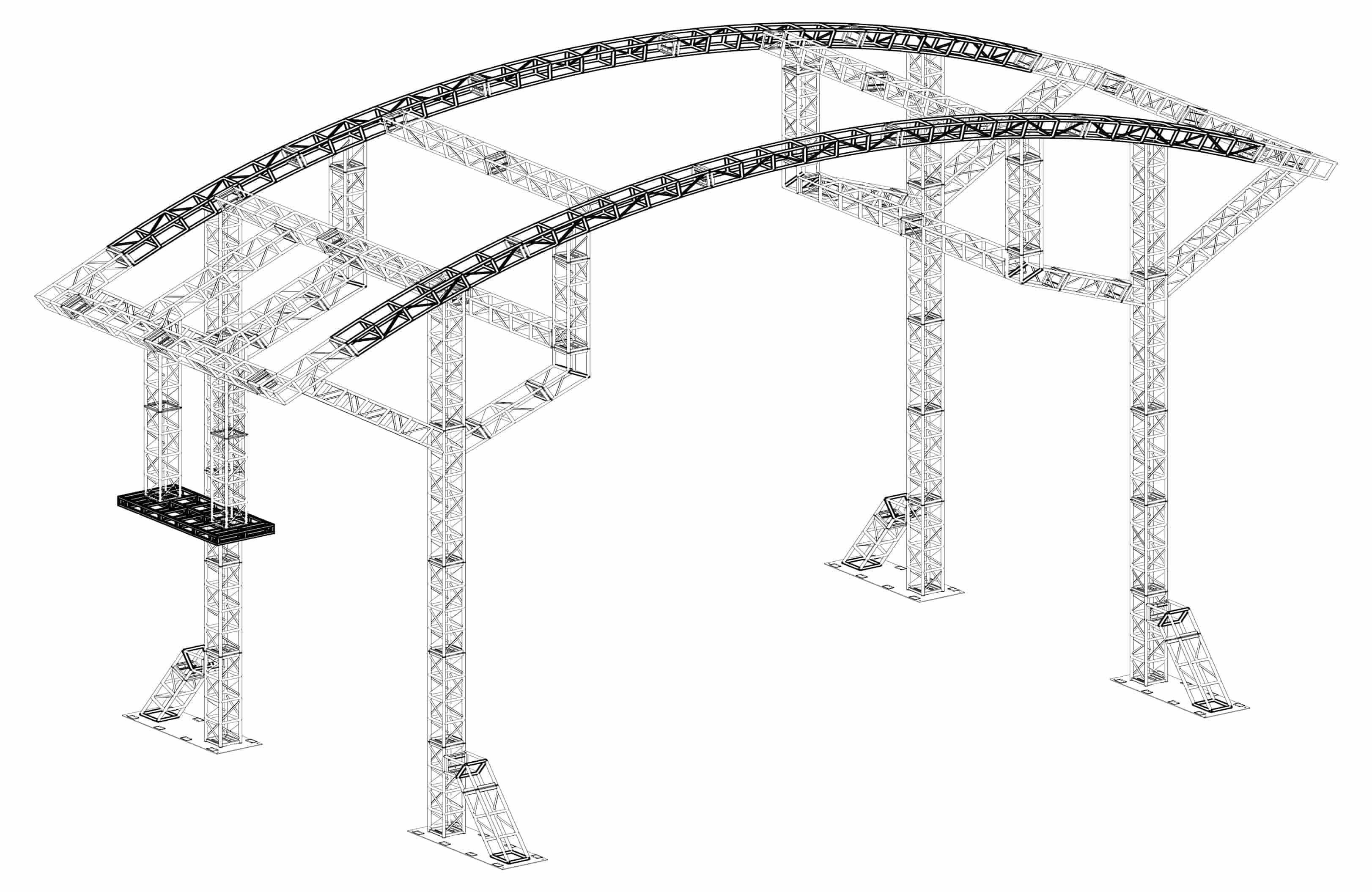 Cette structure en treillis courbé de 18 m x 5 m x 12 m est conçue sur mesure pour les performances acrobatiques. Selon les exigences du client, le côté gauche de la structure doit être plus haut de 60 cm que le côté droit, et les parties suspendues de chaque côté doivent être espacées de 8 m.